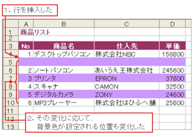 なお、セルの行番号を元に条件を設定しているので、行を挿入したり削除したりしても、行数の変化に応じて、背景色の位置も変化します。行数が増える場合に備えて、条件付き書式を設定するセル範囲を広めにしておくと良いでしょう。![]() |