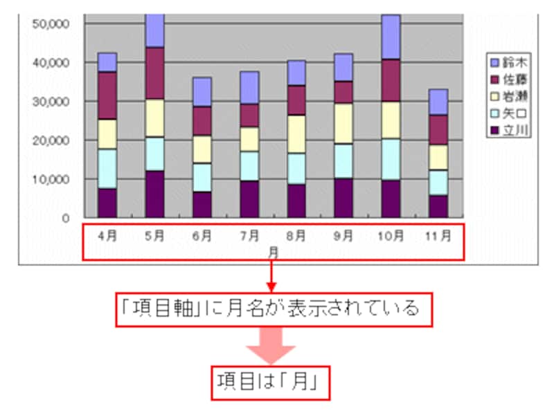 一方、項目の内容を確認するには、その名の通り「項目軸」(横軸)の内容を見ます。今回のグラフでは、月名が表示されているので、項目は「月」であることがわかります。