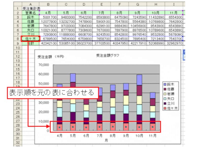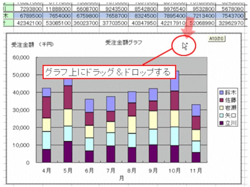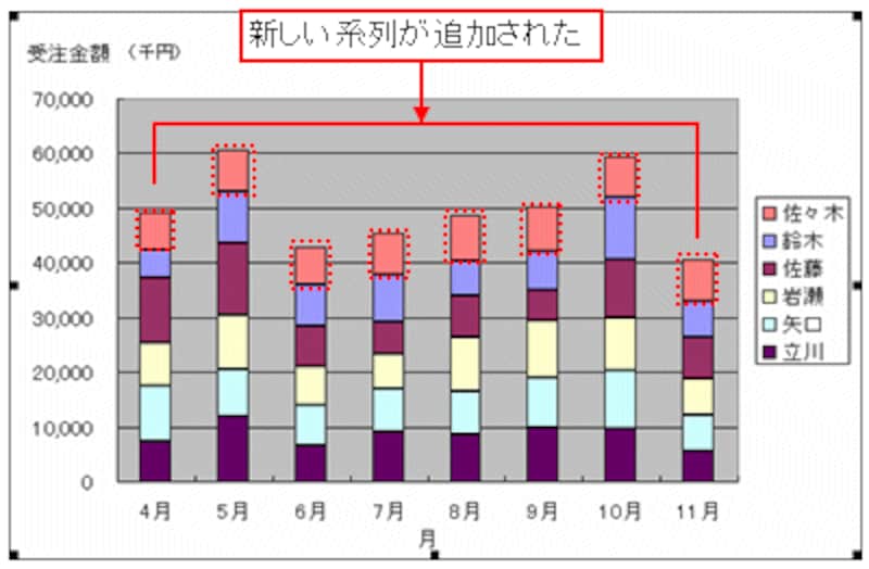 今回のグラフで、営業の人員が増えた場合など、営業データをグラフに追加するには、系列を追加します。今回の系列は行単位のデータです。まず、追加したい営業データ(ここでは「佐々木」)の範囲を選択します。