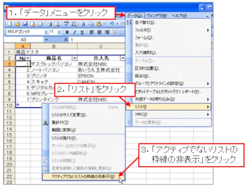 この枠線ですが、「リスト範囲内が選択されていないときは表示させたくない」という場合もあるでしょう。そんなときは、「データ」メニュー→「リスト」→「アクティブでないリストの枠線の非表示」をクリックします。