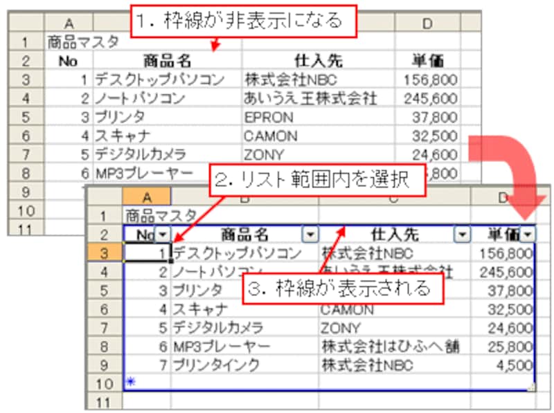 これで、枠線が非表示になります。リスト範囲内をクリックすると枠線が表示されます。
