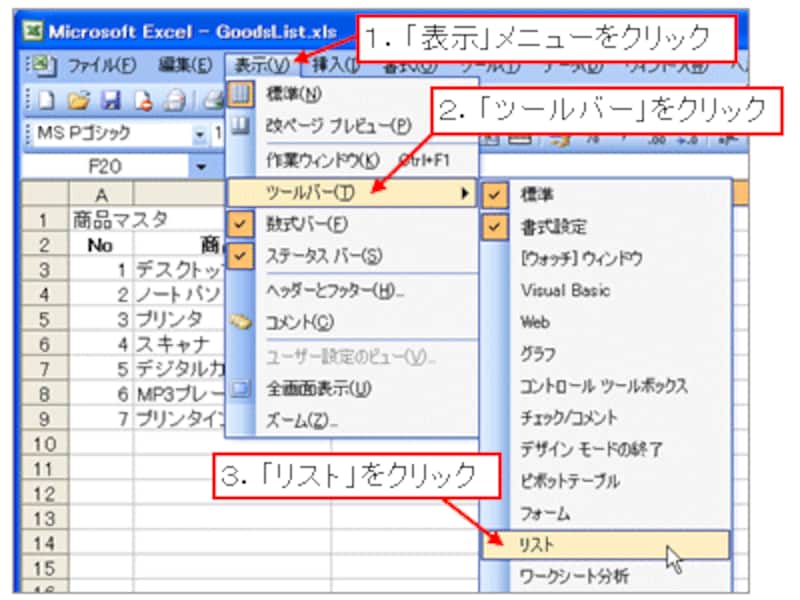 最後に、リスト機能を利用するためのツールバーを紹介しておきましょう。「表示」メニュー→「ツールバー」→「リスト」をクリックしてください。