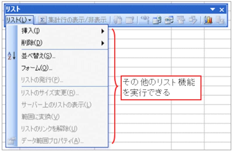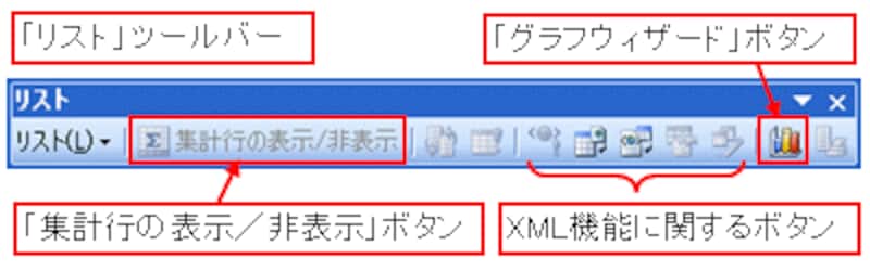 リスト機能を実行するための「リスト」ツールバーが表示されます。「集計行の表示/非表示」ボタンで集計行の表示を切り替えることができたり、「グラフウィザード」ボタンでグラフを作成することができたりします。また、前回紹介したように、リスト機能は「XML」機能とも深い関わりがあるので、XML機能に関するボタンも配置されています。