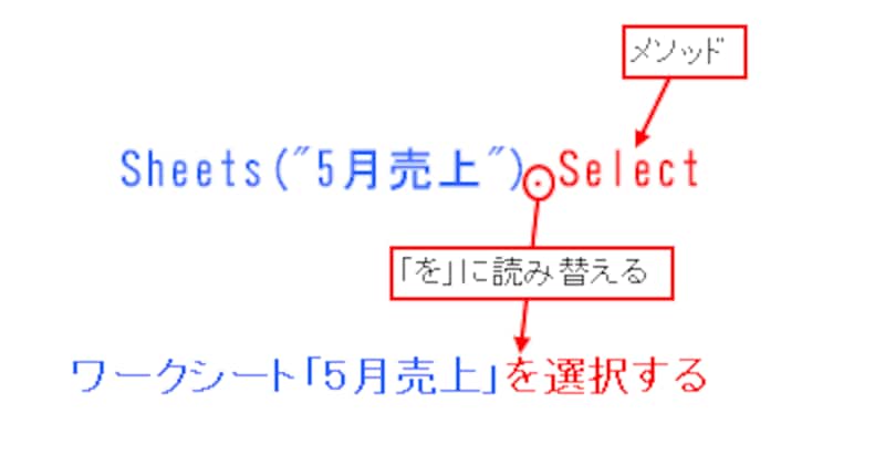 この「Select」がメソッドです。Selectメソッドは、ワークシートを選択するメソッドです。オブジェクトの記述に続いて「.(ピリオド)」が記述されています。この「.」は「を」や「に」に読み替えると良いでしょう。したがって、このステートメントは「ワークシート「5月売上」を選択する」と読み解くことができます。