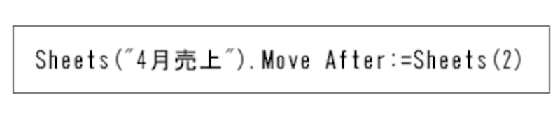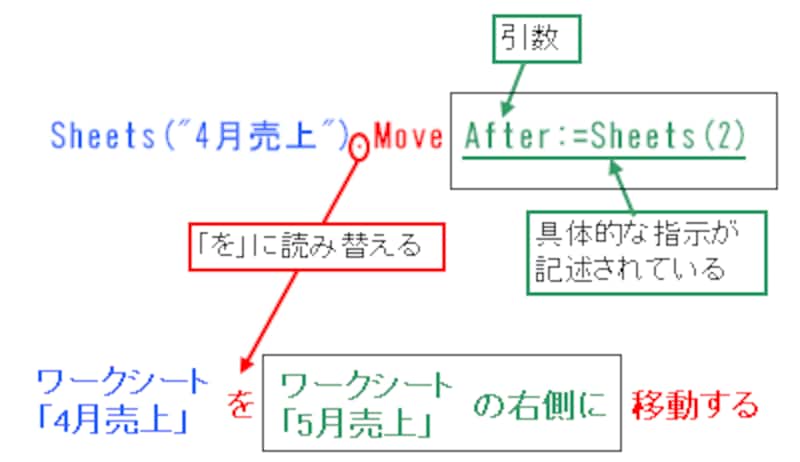 「.」に続いて記述されているMoveメソッドは、ワークシートを移動するメソッドです。そして、半角スペースに続いて記述されている「After」は「引数」と呼ばれるキーワードで、メソッドに関する具体的な指示が記述されています。引数の値は「:=」に続いて記述されます。