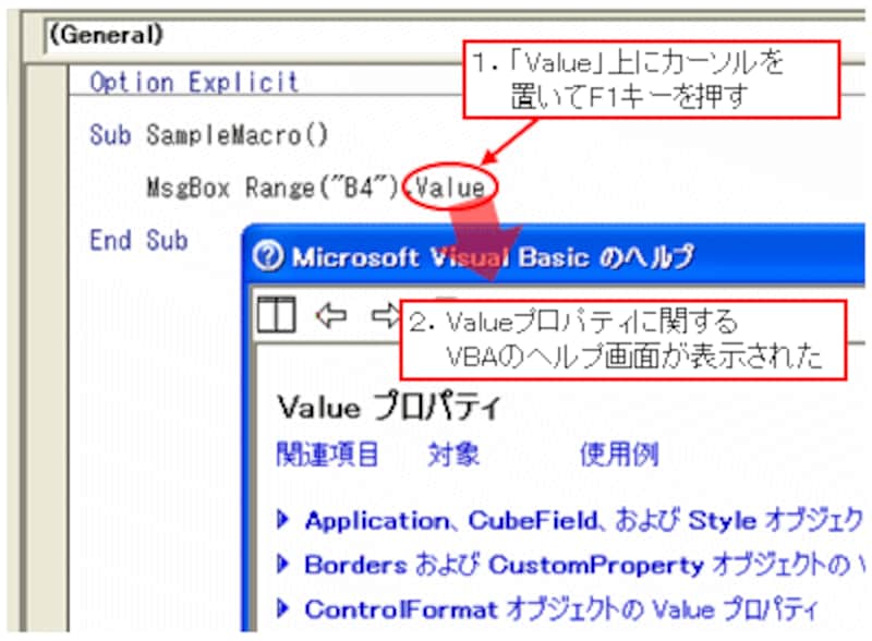 ところが、2番目と3番目の構文の場合、構文の形に違いがないため、ぱっと見てプロパティなのかメソッドなのかを区別できません。この場合は、そのキーワード上にカーソルを置いてF1キーを押してみましょう。すると、VBAのヘルプが起動して、カーソルを置いたキーワードのヘルプが表示されます。表示されたヘルプを見れば、プロパティなのかメソッドなのかを確認できますし、もちろん、キーワードの詳細についても調べることができます。