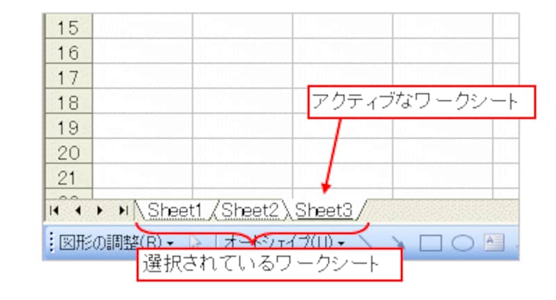 下図の場合、Sheet1~Sheet3が「選択されているワークシート」で、そのうち、Sheet3が操作対象になっているワークシート、つまり「アクティブなワークシート」です。