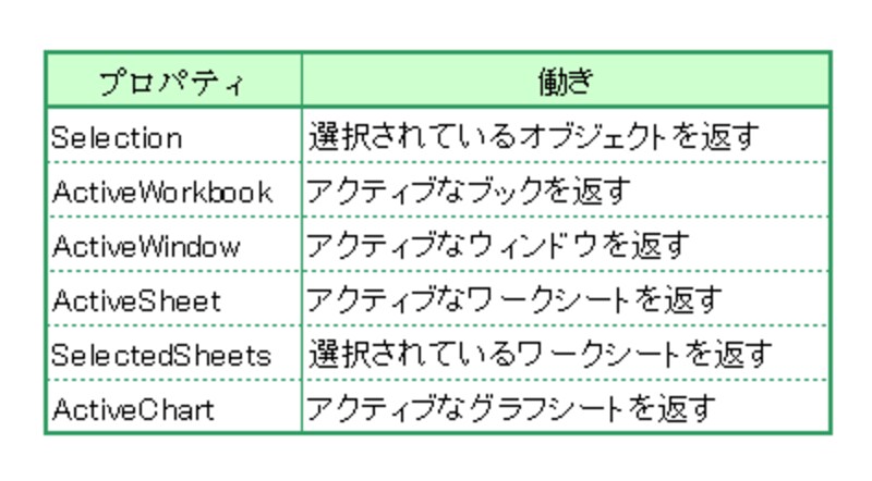 こういった代名詞のようなプロパティは他にも種類があって、マクロ記録で作成されたVBAプログラムで頻繁に登場します。ここで、主なものをまとめてチェックしておきましょう。