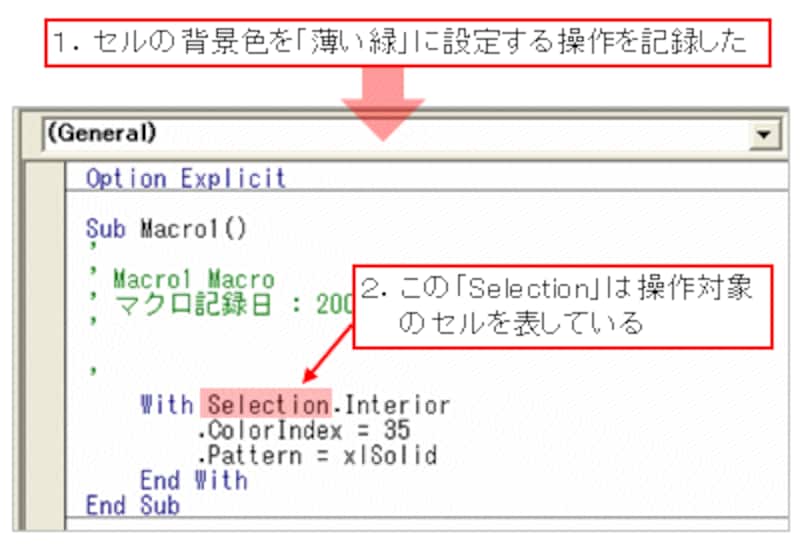 マクロ記録で作成されたVBAプログラムでは、「Selectionプロパティ」が頻出します。このプロパティは、オブジェクトの種類に関わらず「アクティブなウィンドウで選択されているオブジェクト」を返すプロパティです。英語の「it」や「This」といった代名詞のようなキーワードで、Selectionプロパティが何を指しているのか、注意しながら読む必要があります。![]() |
