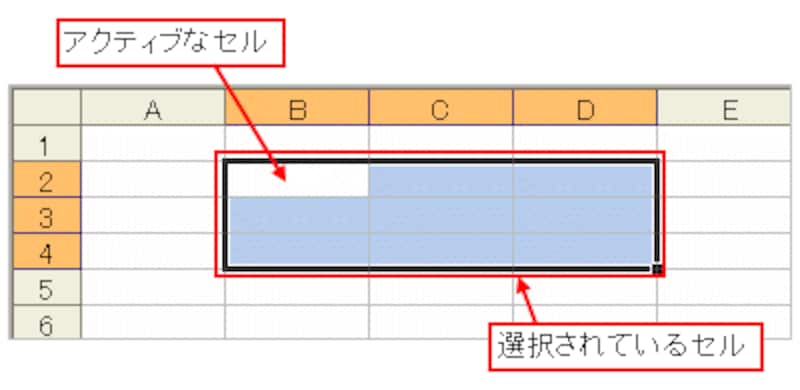 例えば、下図の場合、セルB2~セルD4は「選択されているセル」で、そのうち、セルB2が操作対象になっているセル、つまり「アクティブなセル」です。