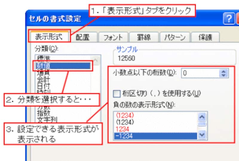 表示された「セルの書式設定」ダイアログボックス内の「表示形式」タブをクリックします。「分類」で設定したい表示形式の分類を選択すると、右側の種類に設定できる表示形式が表示されます。