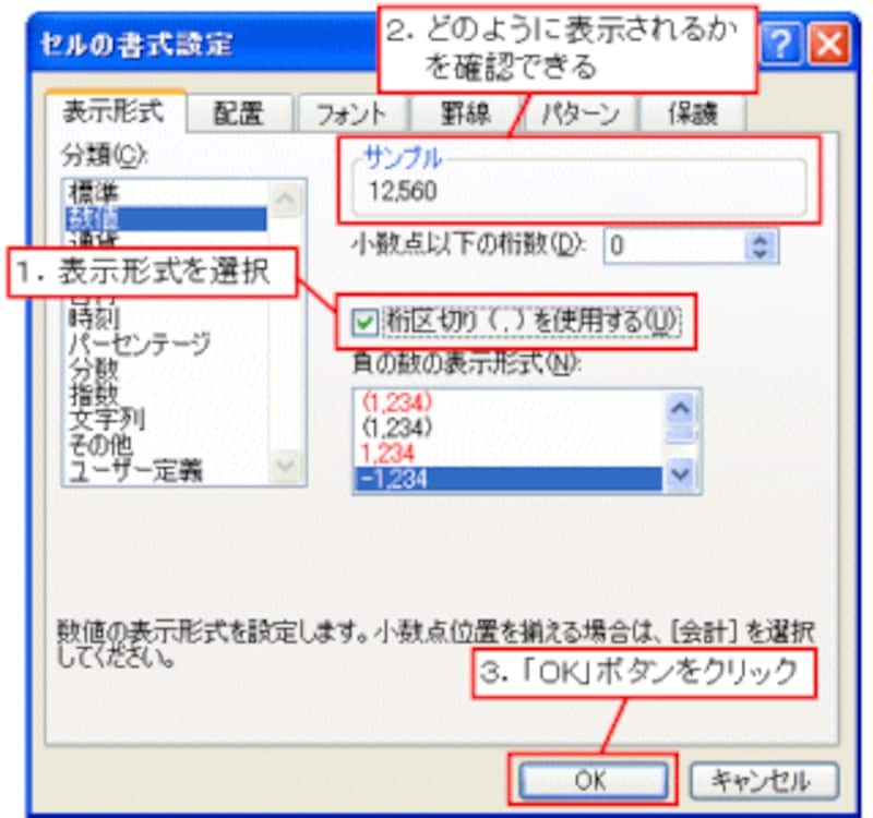 表示形式を選択すると、上の「サンプル」で、実際に入力されているセルの値がどのように表示されるか、を確認できます。設定したい表示形式が決まったら「OK」ボタンをクリックします。