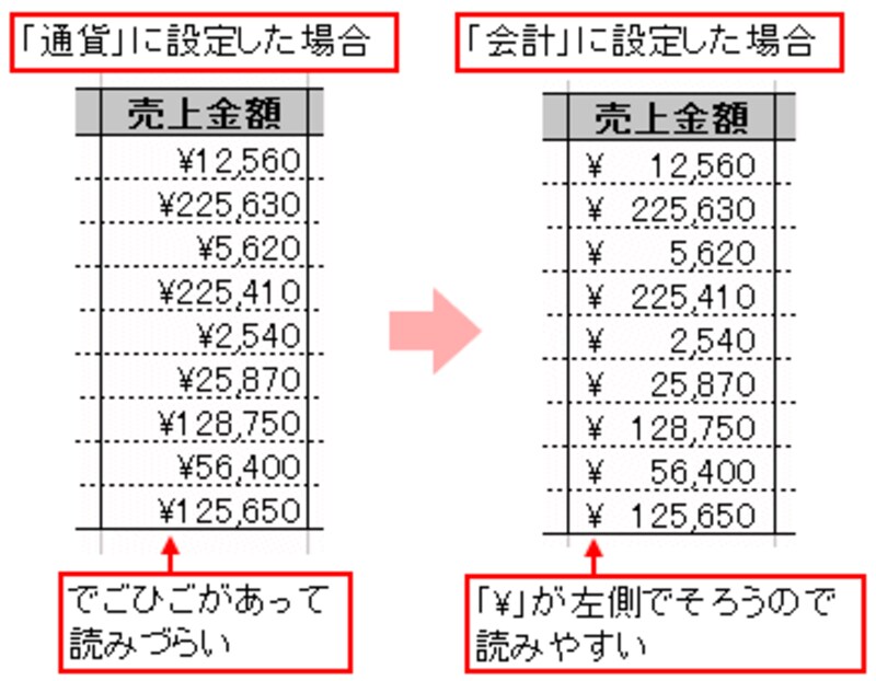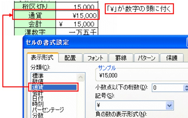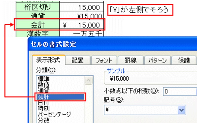 分類の「通貨」「会計」は、共に、数字に「?」と桁区切り(,)を同時に付加する設定です。「通貨」に設定すると、「?」が数字の頭に付きますが、「会計」に設定すると、「?」が左側でそろいます。![]() |