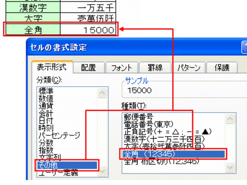 分類で「その他」を選択し、種類で「全角」を選択します。その名の通り、全角表示になります。全角で桁区切りを入れる表示形式も用意されています。![]() |