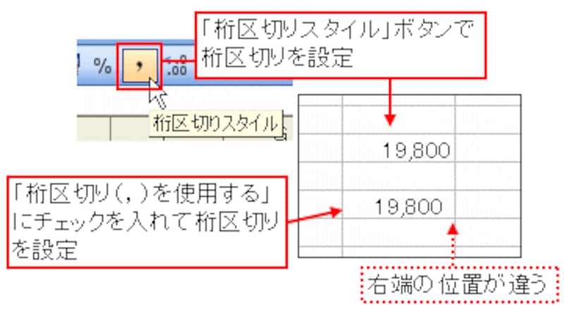 この「桁区切りスタイル」ボタンで設定されるのは、分類「通貨」によって設定される桁区切りです。したがって、分類「通貨」の「桁区切り(,)を使用する」にチェックを入れた場合の表示とは違いがあるので注意が必要です。