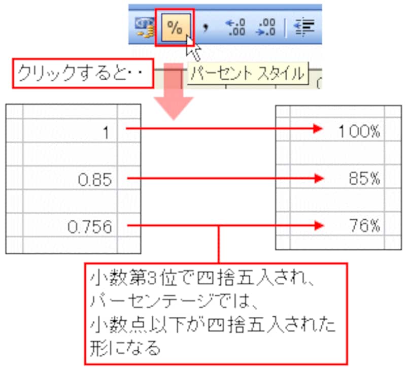 パーセンテージでは、「1」を「100%」、「0.85」を「85%」といった形で表示します。なお、ツールバーボタンで設定した場合、小数第3位で四捨五入されます(パーセンテージでは、小数点以下が四捨五入された形になります)。