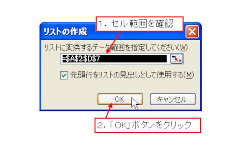 表示された「リストの作成」ダイアログボックスで、リストとして設定されるセル範囲を確認し、「OK」ボタンをクリックします。