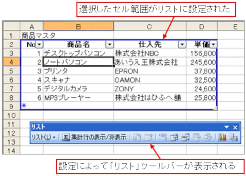 リストとして設定したいセル範囲を選択し、「データ」メニュー→「リスト」→「リストの作成」をクリックします。![]() |