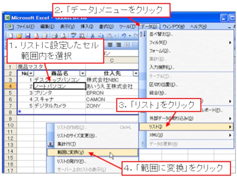 最後に、リストに設定したセル範囲を、元のセル範囲の形式に戻す方法を紹介しておきましょう。リストに設定したセル範囲内を選択して、「データ」メニュー→「リスト」→「範囲に変換」をクリックします。