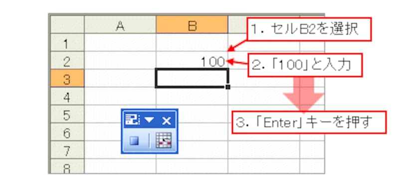 セルB2を選択して「100」と入力し、「Enter」キーを押します。