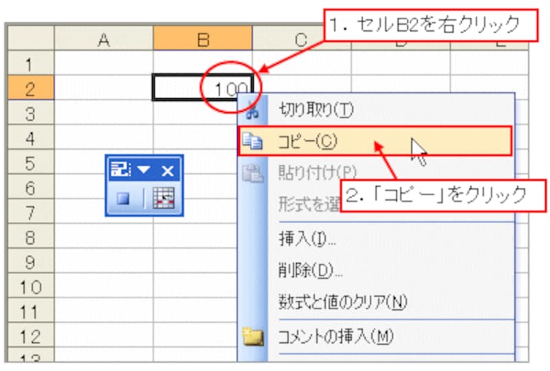 セルB2を右クリックし、表示されたショートカットメニューで「コピー」をクリックします。
