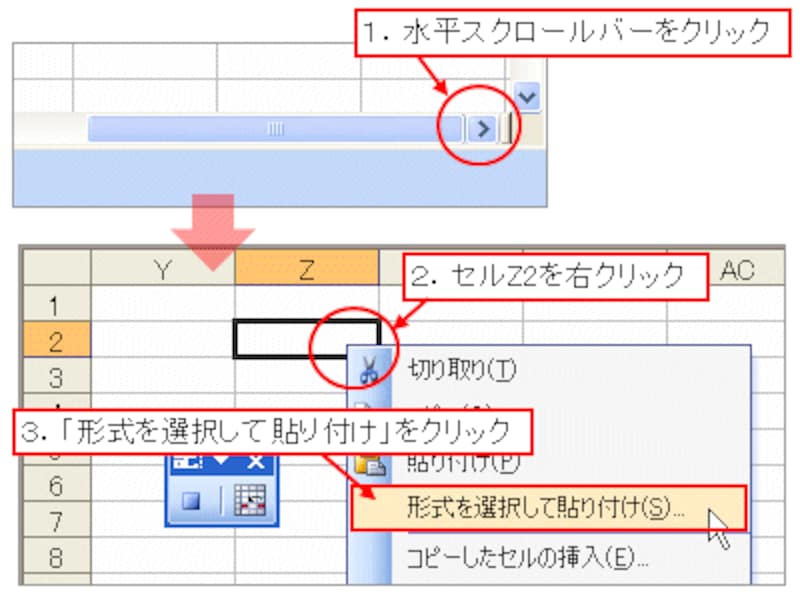 水平スクロールバーをクリックして横方向にスクロールし、セルZ2を右クリックして、表示されたショートカットメニューから「形式を選択して貼り付け」をクリックします。