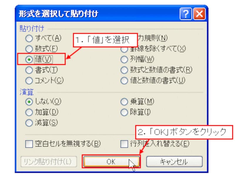 表示された「形式を選択して貼り付け」ダイアログボックスで「値」を選択して「OK」ボタンをクリックします。