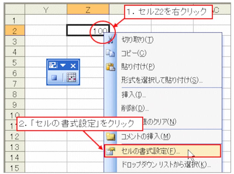 セルZ2を右クリックし、表示されたショートカットメニューで「セルの書式設定」をクリックします。