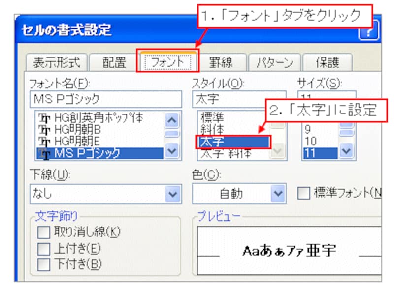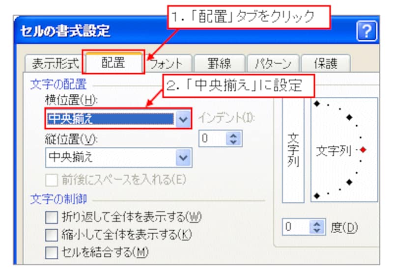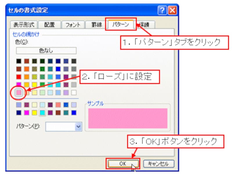 表示された「セルの書式設定」ダイアログボックスの「配置」タブで「横位置」を「中央揃え」に設定し、「フォント」タブで「スタイル」を「太字」に設定し、「パターン」タブで「色」を「ローズ」に設定し、「OK」ボタンをクリックします。