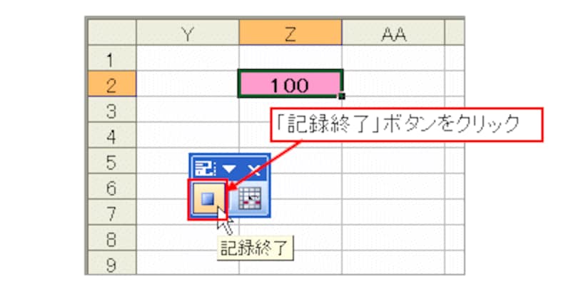 「記録終了」ボタンをクリックして、マクロ記録を終了します。