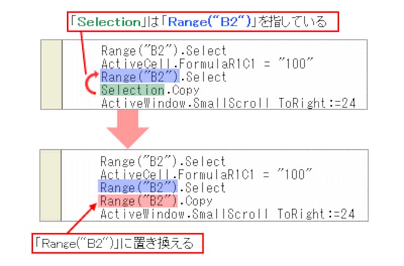 このSelectメソッドとSelectionプロパティ。Selectメソッドで選択したオブジェクトをSelectionプロパティで参照する、という流れになっていますが、ちょっとムダがありますね。「Selection」は「Range("B2")」を指しているので、Selectionプロパティ部分をオブジェクト(「Range("B2")」)に置き換えてスッキリさせます。