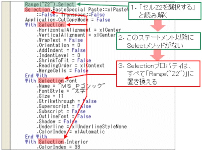 同様に6行目の「Range("Z2").Select」は「セルZ2を選択する」と読み解けます。そして、このステートメント以降にSelectメソッドがないので、この後に記述されているSelectionプロパティは、すべて「Range("Z2")」に置き換えます。