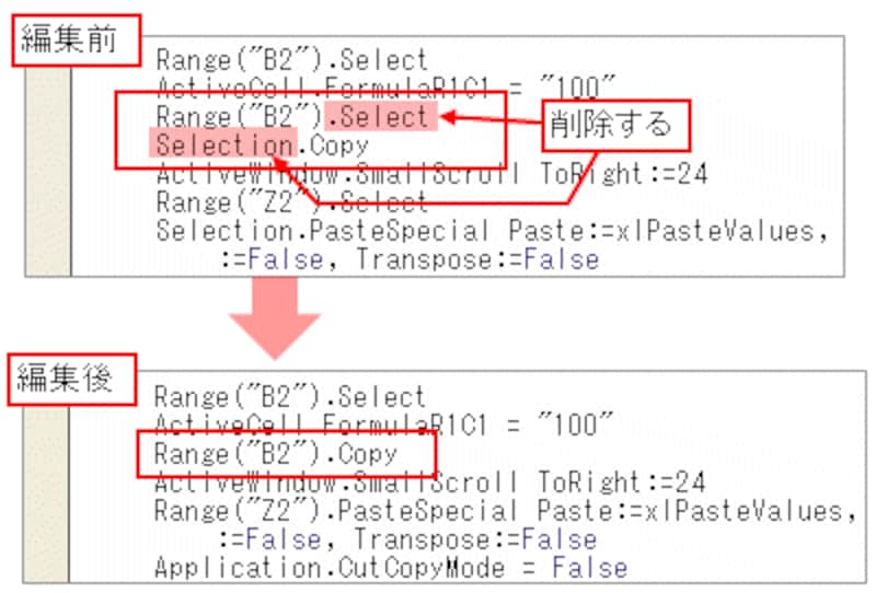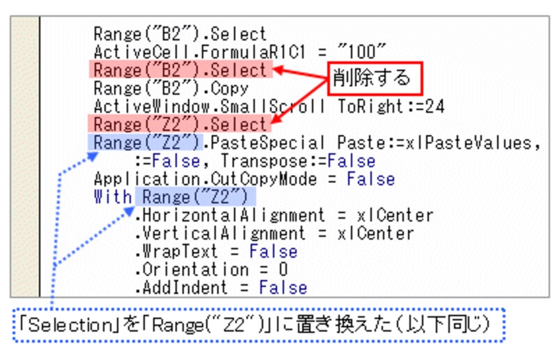 なお、これらの編集は、慣れてくると「.Select」と「Selection」を削除する、という見方で編集できます。