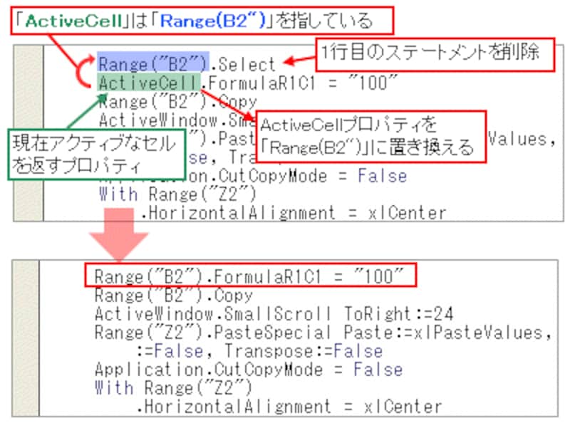 また、今回の場合、1~2行目のSelectメソッドと「ActiveCell」プロパティも同様に編集できます。ActiveCellプロパティは現在アクティブなセルを返すプロパティです。ここでは選択されているセルB2がアクティブなセル、つまり「ActiveCell」は「Range(B2")」を指していることになるので、ここでは、ActiveCellプロパティを「Range(B2")」に置き換えて、1行目のステートメントを削除します。