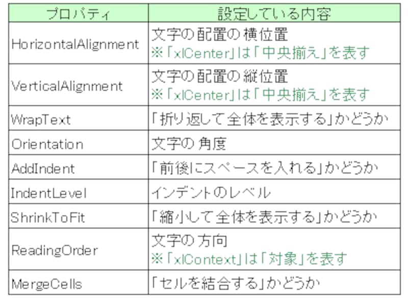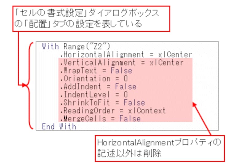 つまり、このWithステートメントは、「セルの書式設定」ダイアログボックスの「配置」タブの設定を表していることがわかります。ここでは、文字の配置の「横位置」を「中央揃え」に設定しただけなので、HorizontalAlignmentプロパティの記述以外は削除します。