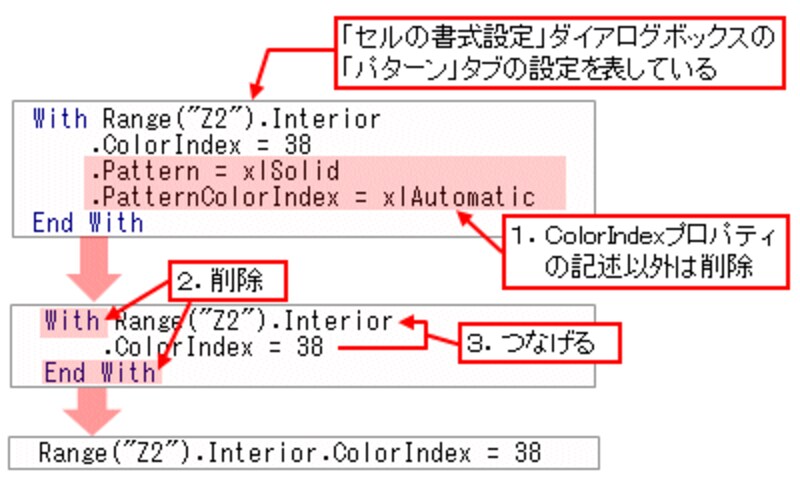 Withステートメントのオブジェクト部分のInteriorプロパティでセルの内部を表すInteriorオブジェクトを取得していることからも分かりますが、このWithステートメントは「セルの書式設定」ダイアログボックスの「パターン」タブの設定を表しています。ここでは、セルの「背景色」を「ローズ」に設定しただけなので、ColorIndexプロパティの記述以外は削除し、さらに「オブジェクト. プロパティ = 設定値」の構文の形に修正します。