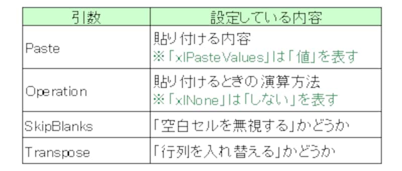 PasteSpecialメソッドの具体的な指示を表す引数の内容を確認してみましょう。