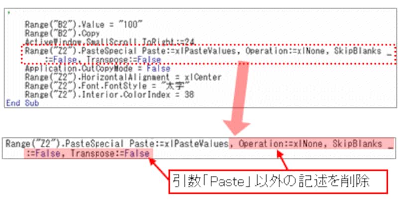 「操作した内容以外の状態」は、メソッドの引数にも記述されている場合があります。現在のステートメントの4行目をご覧下さい。「PasteSpecial」は「形式を選択して貼り付け」の操作を表すメソッドです。したがって、「Range("Z2").PasteSpecial」までの部分は、「セルZ2に形式を選択して貼り付ける」と読み解けます。貼り付ける内容は、2行目に記述されているとおり、セルB2をコピーした内容です。![]() |