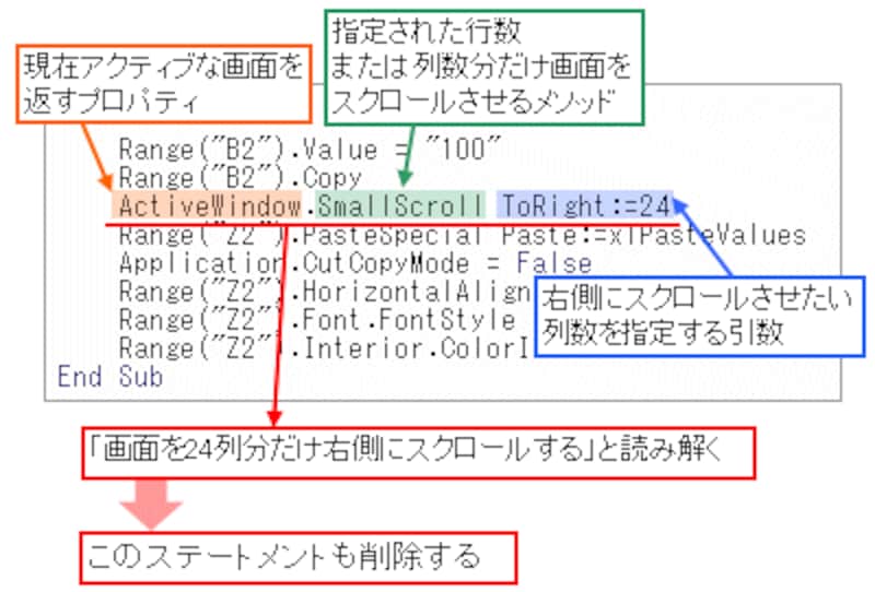 これで、随分とプロシージャの内容がスッキリしてきましたが、さらに削除できる内容があります。3行目をご覧下さい。「ActiveWindow」は、現在アクティブな画面(Windowオブジェクト)を返すプロパティで、「SmallScroll」は、指定された行数または列数分だけ画面をスクロールさせるメソッドです。引数「ToRight」は、右側にスクロールさせたい列数を指定する引数なので、3行目は「画面を24列分だけ右側にスクロールする」と読み解けます。