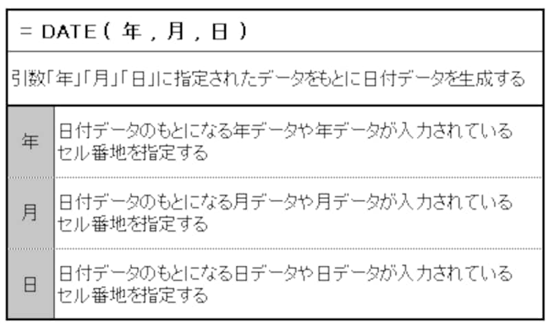 そして、「年」「月」「日」から日付データを生成するDATE関数の登場です。DATE関数の引数「年」「月」「日」に、日付データのもとになる「年」「月」「日」データやそれらが入力されているセル番地を指定します。DATE関数の構文は次の通りです。