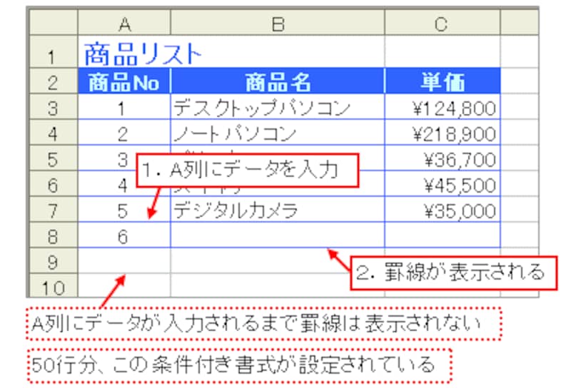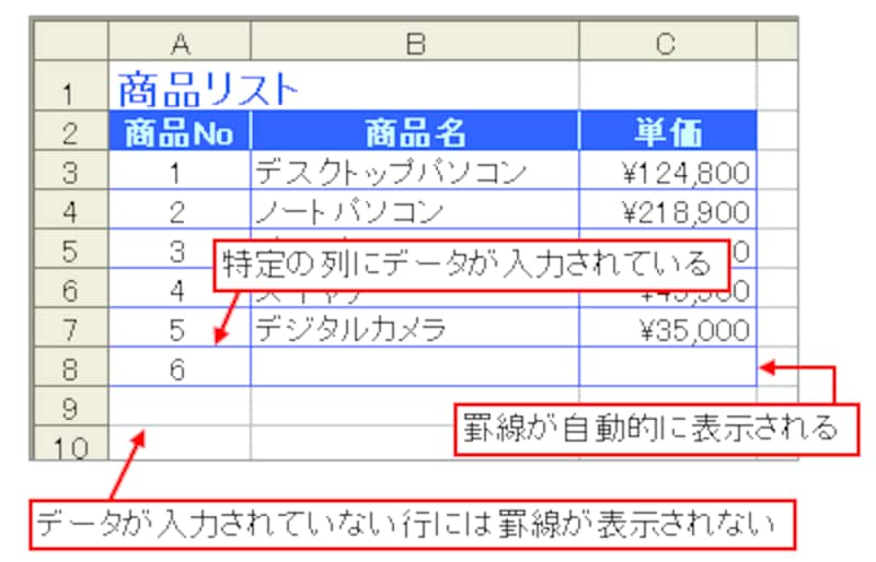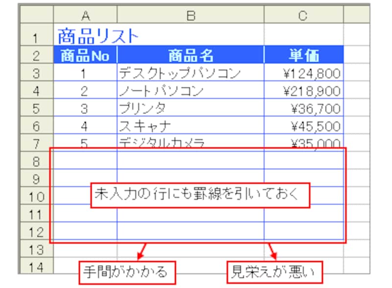 商品リストなど、リスト形式の表を作るとき、未入力の行にも罫線を引いておく場合があると思います。この方法だと、いちいち罫線を設定する手間が発生しますし、見栄えもあまり良くないですね。