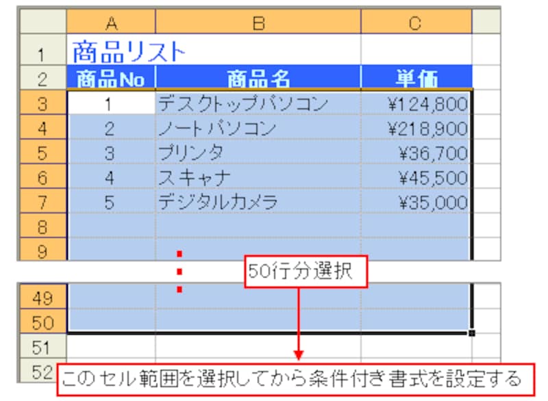 この場合、条件付き書式を設定するセル範囲は、1行の左端から右端までを対象として、必要な行数分となります。下図では、50行分選択しています。