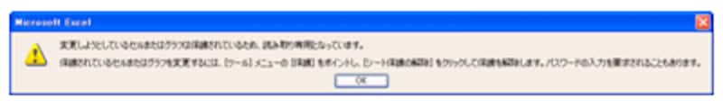 | ※警告メッセージには、次のような文言が表示されています。 「変更しようとしているセルまたはグラフは保護されているため、読み取り専用となっています。」 「保護されているセルまたはグラフを変更するには、[ツール]メニューの[保護]をポイントし、[シート保護の解除]をクリックして保護を解除します。パスワードの入力を要求されることもあります。」 |