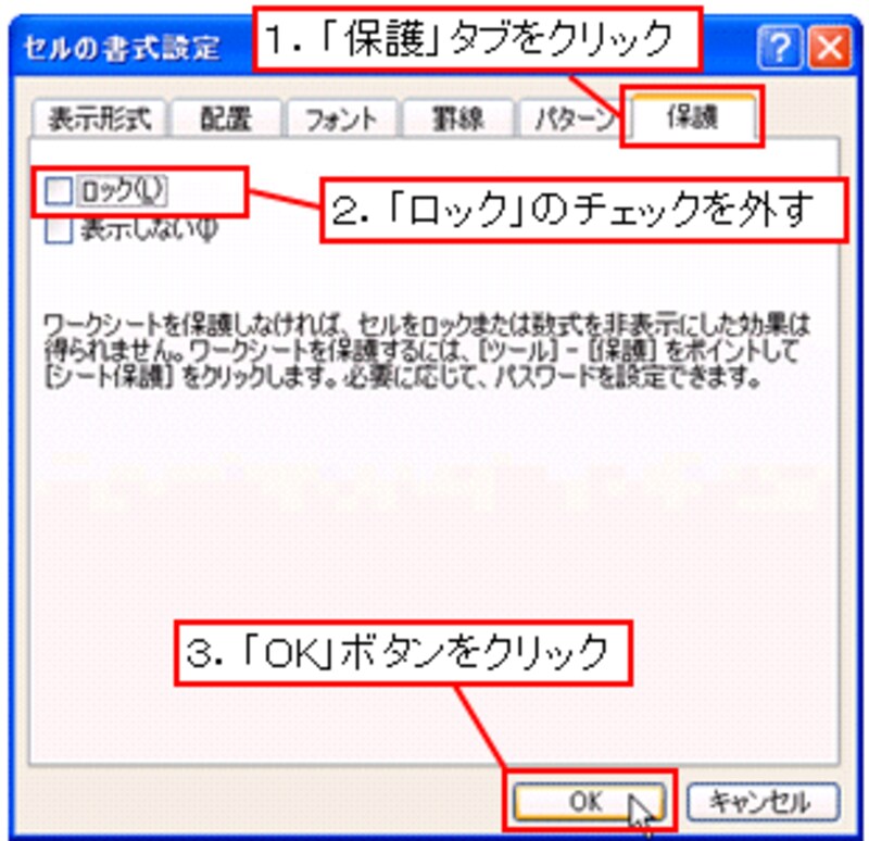 表示された「セルの書式設定」ダイアログボックスの「保護」タブをクリックして、「ロック」のチェックを外し、「OK」ボタンをクリックしてダイアログボックスを閉じます。