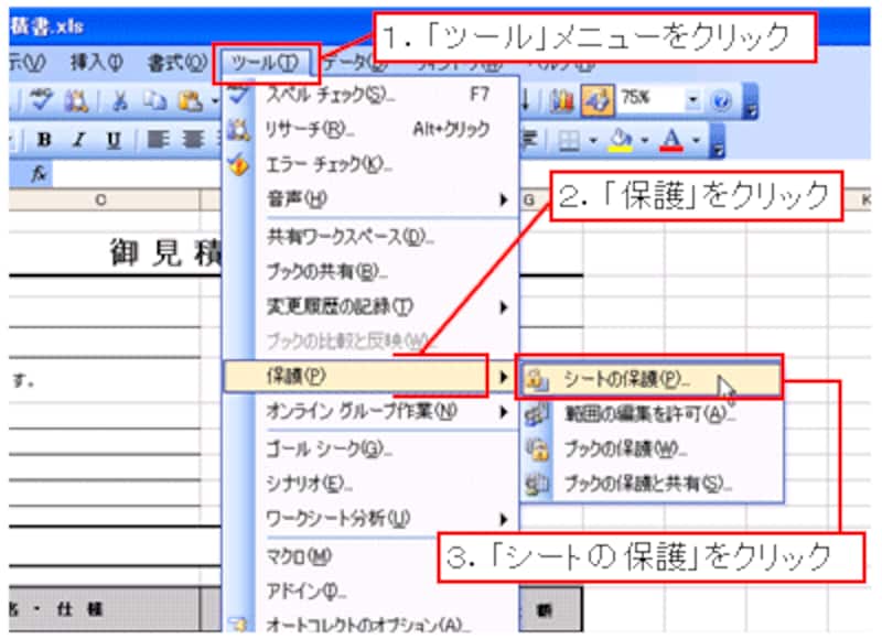 Excel 2003以前の場合は、「ツール」メニュー→「保護」→「シートの保護」をクリックしてください。