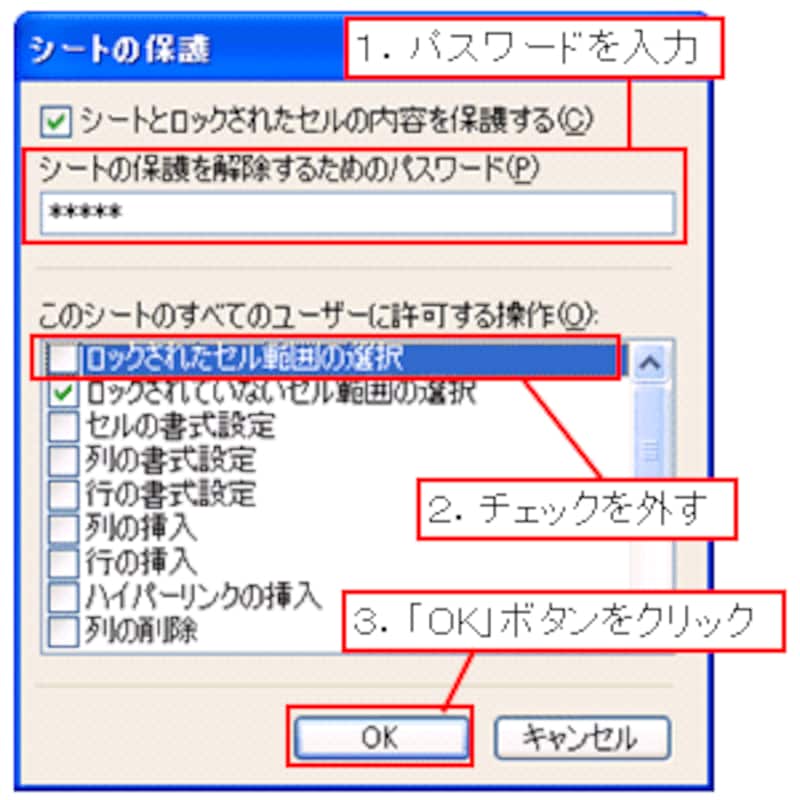 表示された「シートの保護」ダイアログボックスの「シートの保護を解除するためのパスワード」にパスワードを入力し(ここでは「abcde」と入力)、「このシートのすべてのユーザーに許可する操作」で「ロックされたセル範囲の選択」のチェックを外して「OK」ボタンをクリックします。