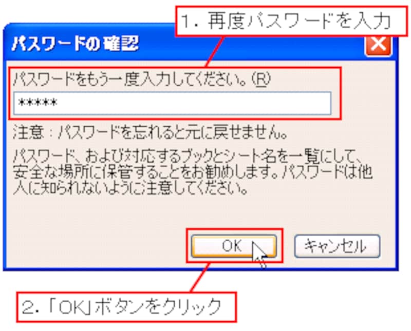 「パスワードの確認」ダイアログボックスが表示されるので、もう一度パスワードを入力して、「OK」ボタンをクリックします。