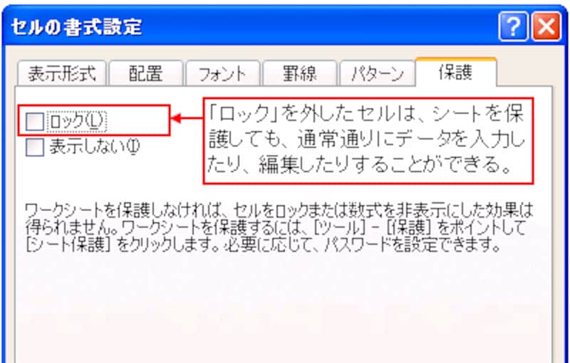 したがって、シートの保護を設定するときは、ロックしないセル、つまり入力したり編集したりできるようにするセルの方を意識します。そして、そのセルの書式設定でロックのチェックを外して、シートを保護します。