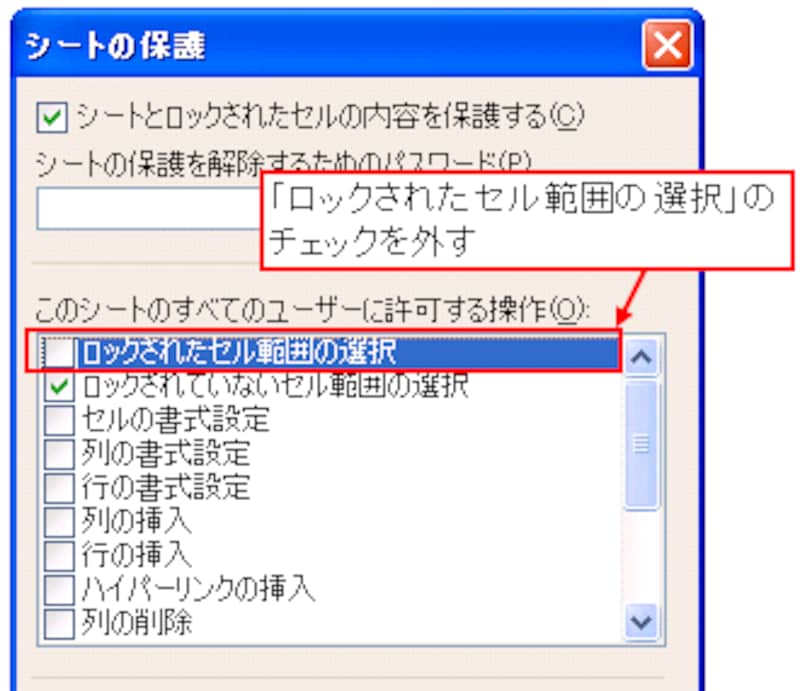 シートの保護を設定するときに「シートの保護」ダイアログボックスが表示されます。この中に「このシートのすべてのユーザーに許可する操作」という一覧があります。この一覧でチェックを付けた項目は、シートを保護した後も操作できるようになります。![]() |