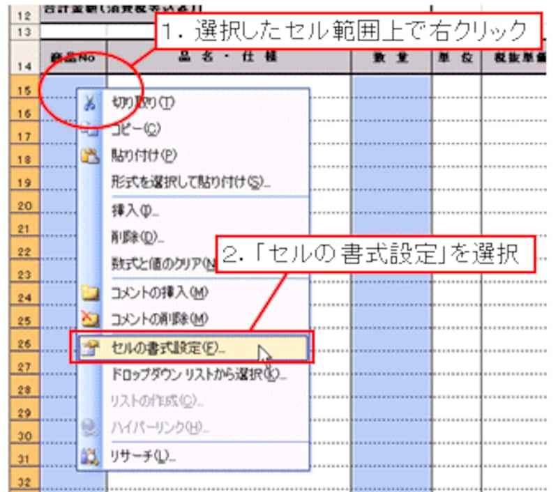 これらのセルを選択し(Ctrlキーを使って離れたセルを選択するとまとめて選択できます)、選択したセル範囲上で右クリックします。表示されたショートカットメニューから「セルの書式設定」を選択します。